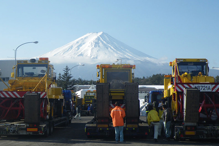 2台編成で低速走行での除雪と安全速度の確保を行います。